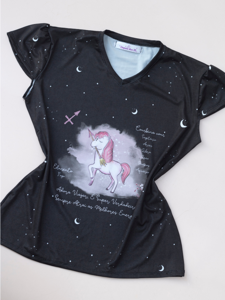 Composição exclusiva elaborada através da montagem de elementos prontos que remetem ao signo de sagitário. A estampa passou pelo processo de Sublimação Total.